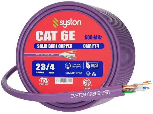SYSTON CAT 6E Ethernet Network Lan Cable Bulk Raw - 600 MHz 23 AWG UTP Solid Bare Copper Wire For Indoor/Outdoor IP PoE Applications, FT4/CMR/Riser-Rated ETL Listed RoHS Without RJ45 End - Purple, 30m