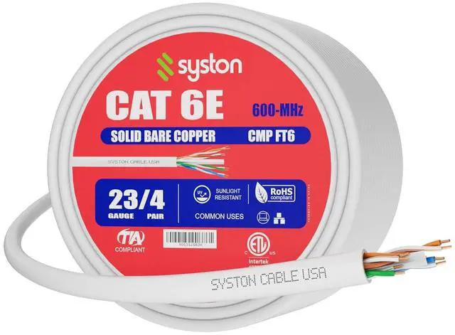 SYSTON CAT 6E Ethernet Network Lan Cable Bulk Raw - 600 MHz 23 AWG UTP Solid Bare Copper Wire For Indoor/Outdoor IP PoE Applications, FT6/CMP/Plenum-Rated ETL Listed RoHS Without RJ45 End - White, 76m