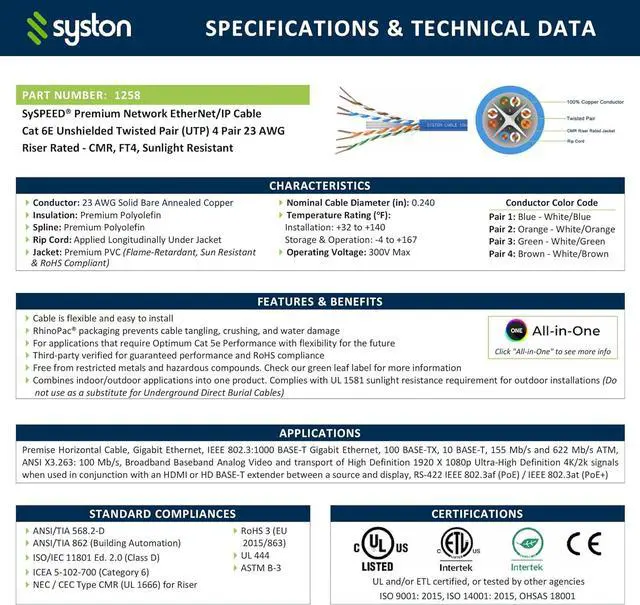 Strict Standard: Standard compliances and certifications - ANSI/ TIA 568-2.D, ANSI/TIA 862 (building automation), ISO/IEC 11801, ICEA S-102-700 (Category 6), NEC/CEC type CMR (UL1666) for riser, UL and/or ETL listed and RoHS compliant.