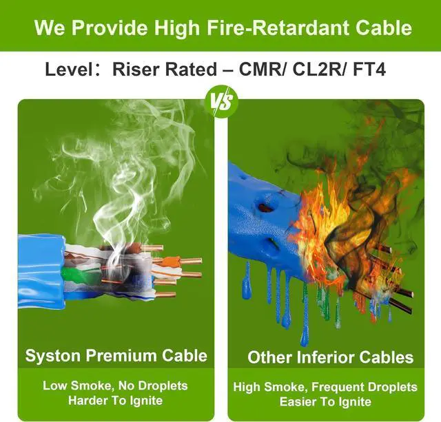 • CMR (Riser-Rated): Our cable is designed with your safety in mind. It features a CMR/CL3R/FPLR (Riser-Rated) flame-retardant rating that provides peace of mind in case of fire. This type of cable is commonly used in commercial projects where enhanced fire safety requirements are needed, exceeding the basic fire safety rating of CM cables.