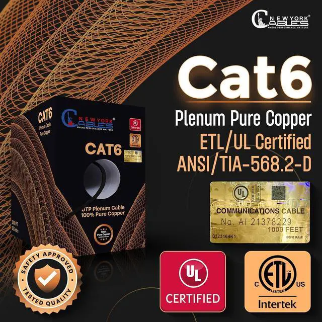 • & : Certified for plenum spaces, this Cat6 plenum 1000ft cable features a CMP-rated fire-retardant jacket, perfect for air ducts, ceilings, and areas requiring strict NFPA fire safety compliance. Fully UL & ETL certified, Cat6 CMP 1000ft cable meets all building inspection codes and is safe for residential and commercial installations.
