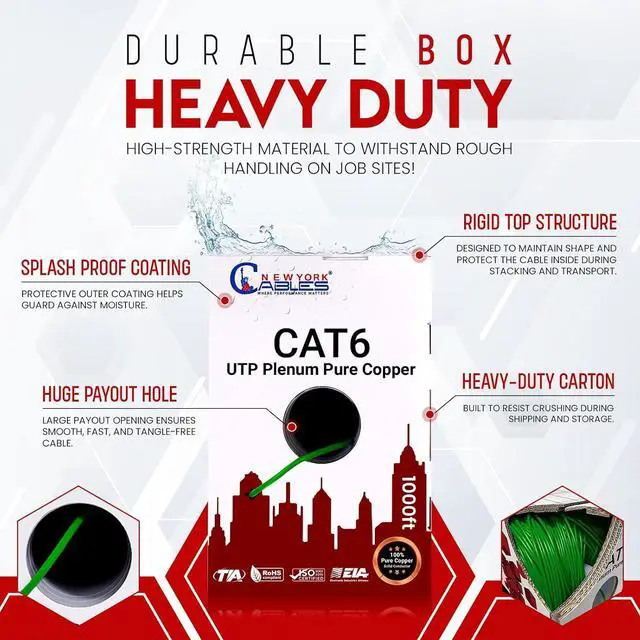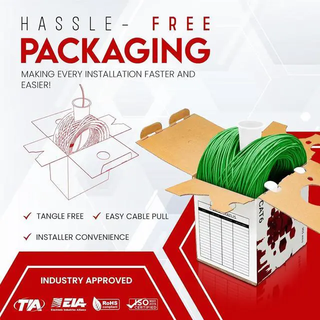 - & - ?: Our cat6 ethernet cable 1000ft comes in a sturdy wooden box with sequential ft markings and a separator/spline to prevent kinks. The easy-pull box packaging ensures tangle-free and hassle-free storage for your future projects