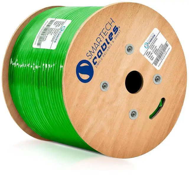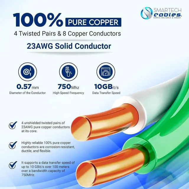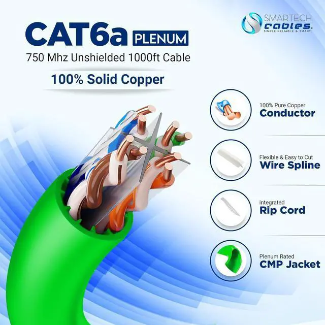 Smartech Cables | Cat6a Plenum Ethernet Cable 1000ft Certified 100% Solid Pure Copper 23 AWG, 10Gbps, 750MHz, PoE++ (4PPoE, up to 90W) | High-Performance Ethernet Cable Cat 6a for Structured Cabling