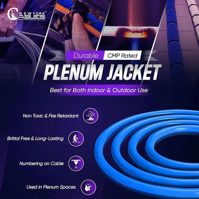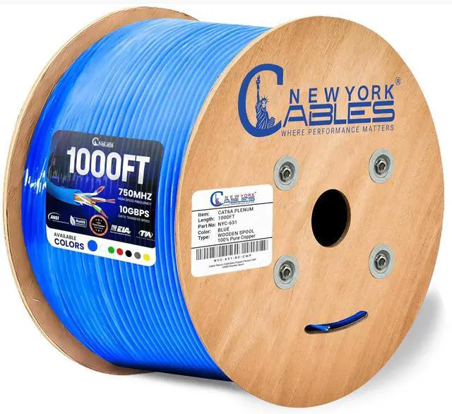 Newyork Cables | Cat6A Plenum (CMP) Cable 1000ft, 750MHz, PoE++ (4PPoE) | 100% Solid Bare Copper, Most Certified Plenum Rated Fire Resistant 10GB High Speed Ethernet Cable | 23AWG (UTP) 4 Pair (Blue)