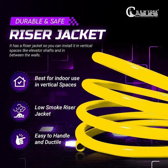 • : Featuring a sturdy riser jacket, this 1000 ft CAT 6 cable is Fire-Safe Jacket and designed for vertical riser applications between floors. Built to protect internal conductors and maintain performance, this CAT6 rise
