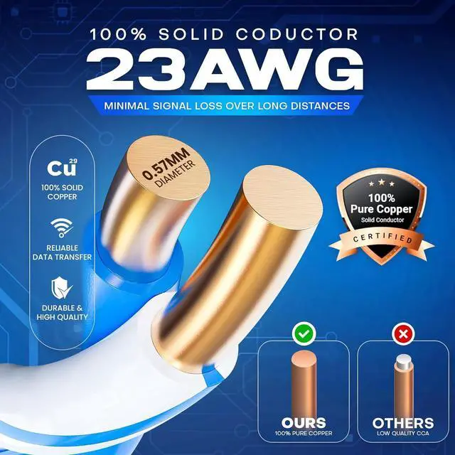 : Built with 23 AWG solid bare copper, this premium Cat6a wire ensures lower resistance, minimal signal loss, and superior conductivity compared to CCA alternatives. The solid copper design supports IEEE 802.3af/at/bt standards, helping this Cat6a cable maintain consistent signal strength while reducing attenuation, electromagnetic interference (EMI), and performance drops in long-distance professional installations..
