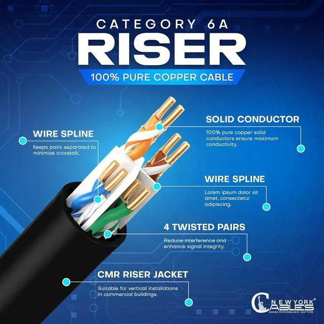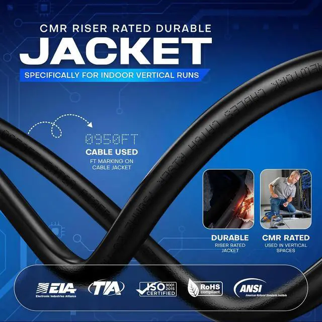 - : This Cat6a riser features a low-smoke CMR jacket designed specifically for indoor vertical runs between floors. Fully compliant with building safety requirements, the Cat6a ethernet cable 1000ft helps limit flame spread in riser spaces while maintaining signal integrity. A dependable choice for offices, data centers, and commercial buildings requiring safe vertical cabling.vertical cabling.