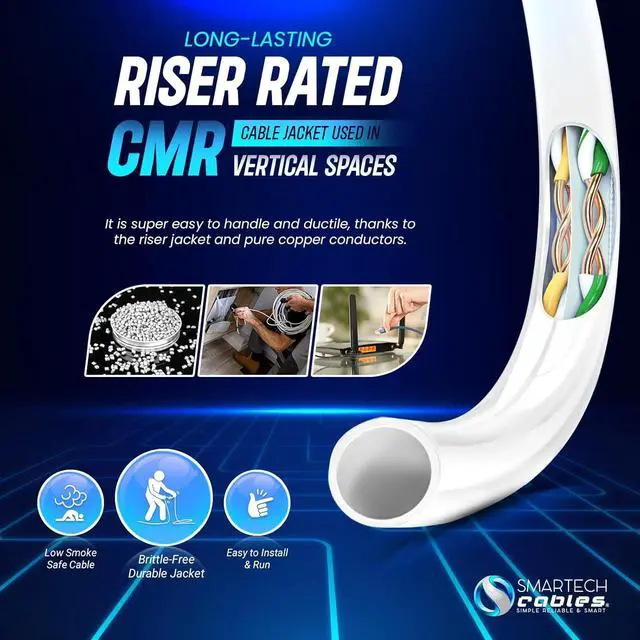 : Designed specifically for indoor vertical runs, this Cat6a ethernet cable features a flame-retardant, low-smoke riser (CMR) jacket that limits flame spread between floors. Fully compliant with ANSI/TIA 568.2-D standards, this Cat6a cable 1000ft is also certified by FCC, CSA, ISO/IES, RoHS, and ETL, making it a trusted solution for code-compliant riser installations.
