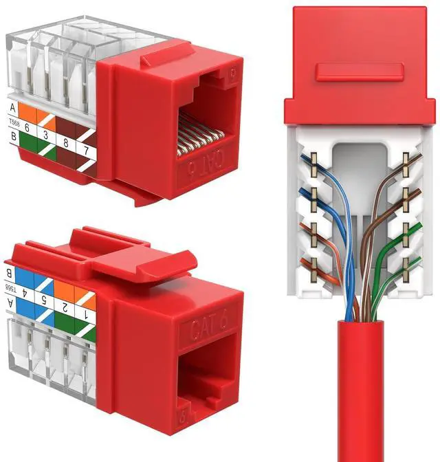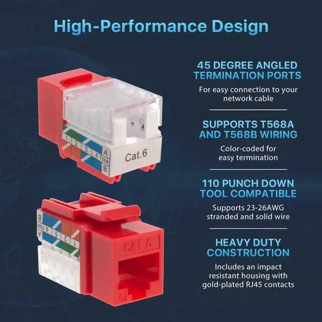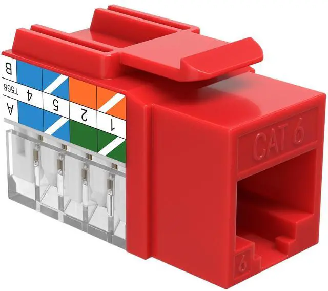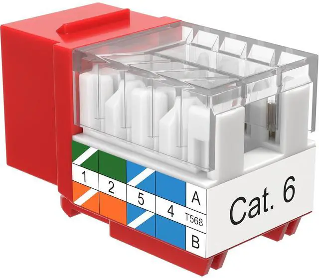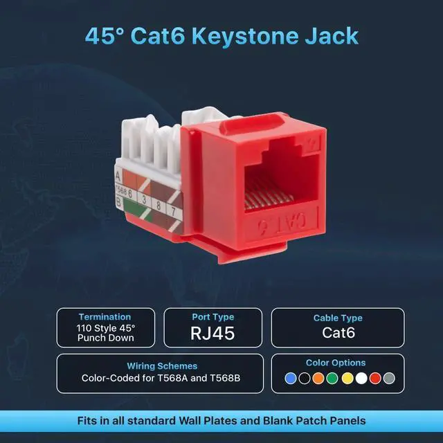 Category-6 (Cat6) Keystone Insert Jack 45-degree angled port for an easy connection to network cables To be used with keystone wall plate or panel Compatible with both T568A and T568B wiring patterns Compatible with 23 or 24 AWG Solid Wires