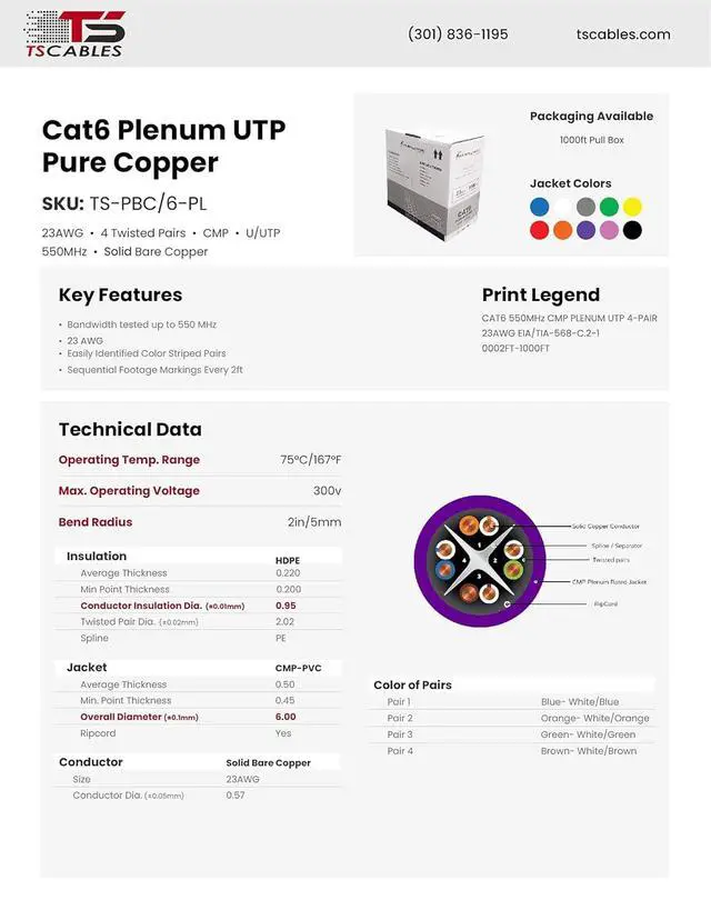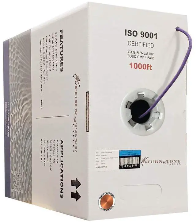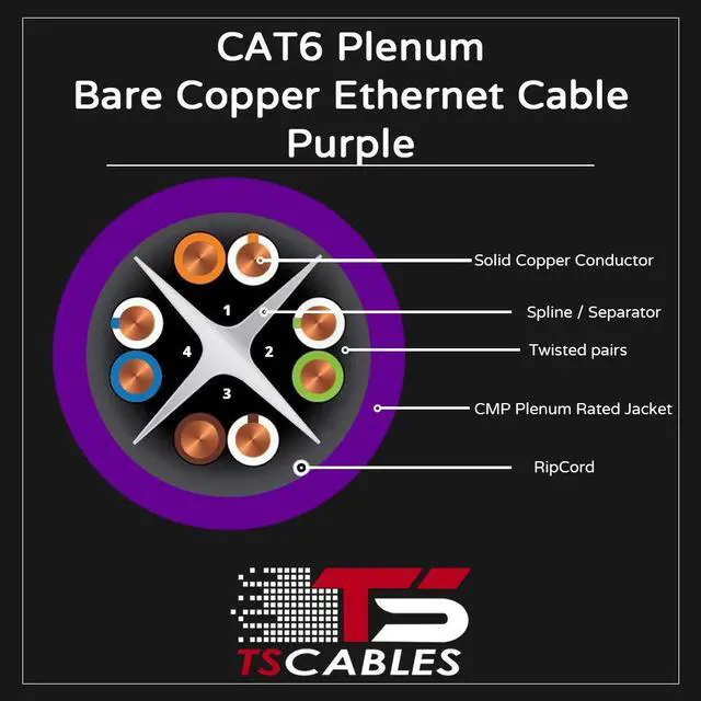 TSCables | Cat6 Plenum (CMP) 1000ft Cable, 23AWG | 100% Solid Bare Copper | 550MHz, PoE++ (4PPoE) | Unshielded Twisted Pair (UTP) Bulk Ethernet Cable, Available in 10 Colors (Purple)