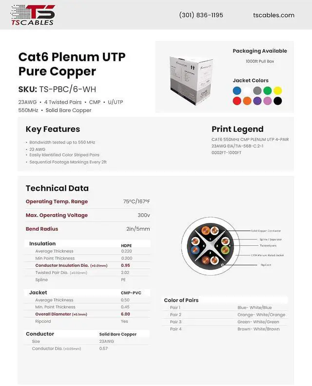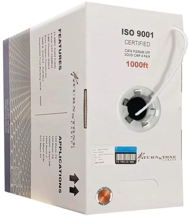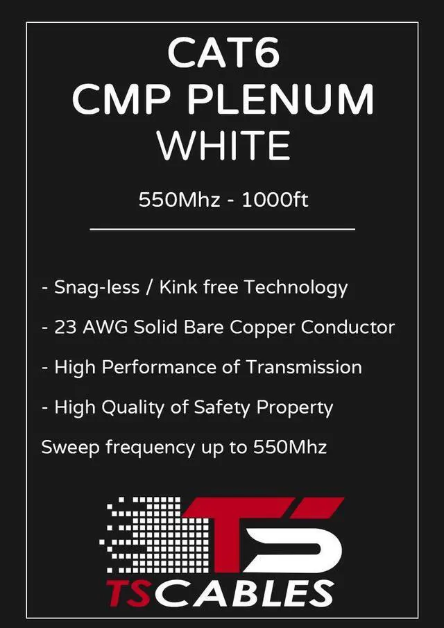 TSCables | Cat6 Plenum (CMP) 1000ft Cable, 23AWG | 100% Solid Bare Copper | 550MHz, PoE++ (4PPoE) | Unshielded Twisted Pair (UTP) Bulk Ethernet Cable, Available in 10 Colors (White)
