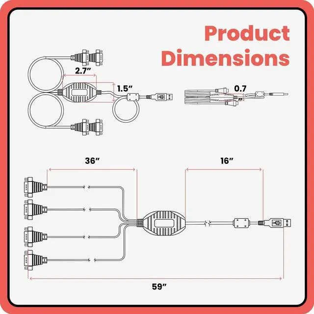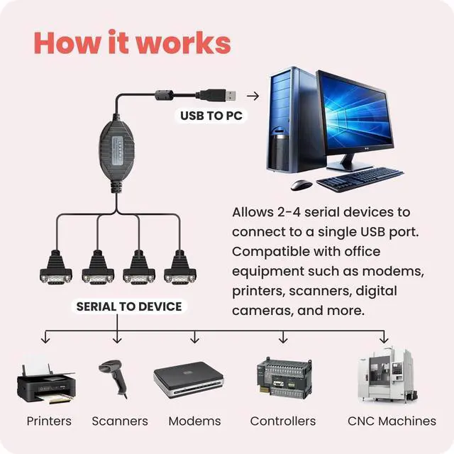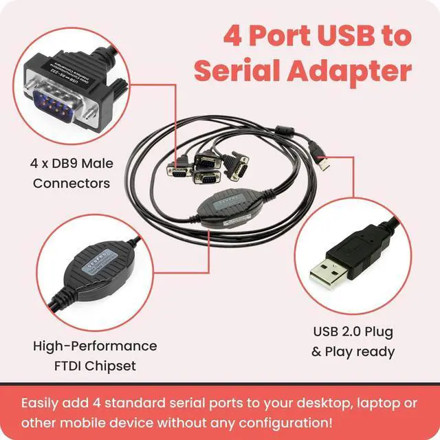 • [ 4 Port USB to RS-232 Serial Adapter ] : 4ft Cable Length - Easily connect multiple legacy DB-9 serial devices to modern USB-equipped computers. Uses include POS systems, barcode scanners, industrial controls, and digital signage applications.