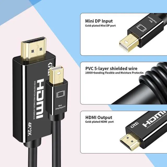 4K@60Hz High DefinitionMini DisplayPort to HDMI cable supports up to 4K(3860x2160)@60Hz, backward compatible with 4K@30Hz, 2K, 1080P, 720P. Immerse yourself in stunning 4K clarity, making your work and presentation more efficient. (Note: for 4K usage, it requires device to support 4K).