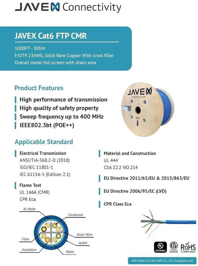 [High-speed Shielded Transmission] JAVEX premium Cat6 23AWG CMR rated network cables meet upto-400Mhz performance to support data transmission and comply with IEEE 802.3af (PoE) / IEEE 802.3at (PoE+) in structure cabling for horizontal and building backbone. The FTP shield design helps prevent EMI and eliminate cross-talk