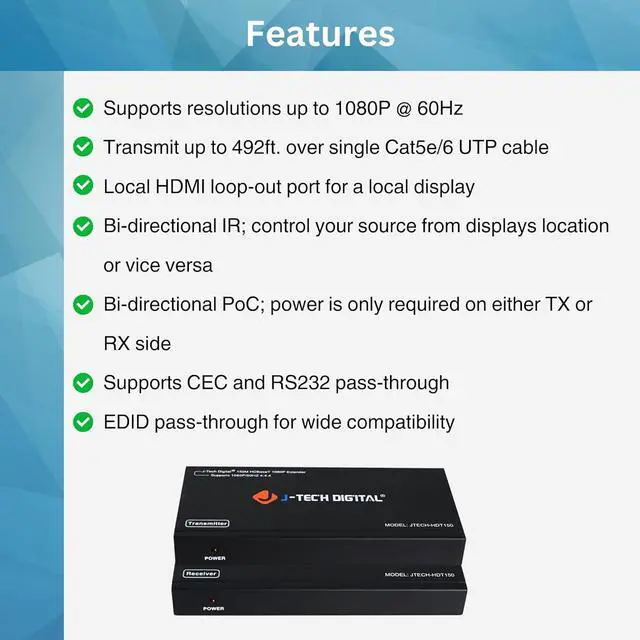 BI-DIRECTIONAL POC, EDID PASSTHROUGH Power is only required one end of the JTECH-HDT150, and with the Bi-Directional POC feature, you can set the power on either the transmitter OR receiver, for maximum convenience. EDID passthrough settings also make for a quick and easy set up allowing you to experience audio and video in the highest settings possible based on the capabilities of your display.