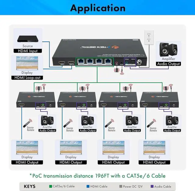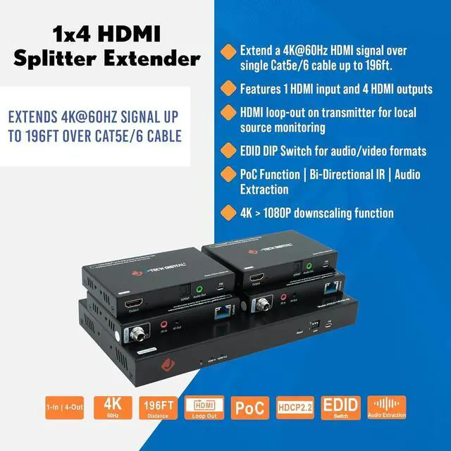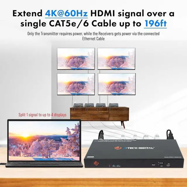 Split 1 4K@60Hz Signal To 4 Outputs: Easily distribute a 4K@60Hz signal to 4 different displays up to 196ft. over single Cat5e/6 cable (per receiver). Please note that this splitter is used to mirror the source image on all connected displays.