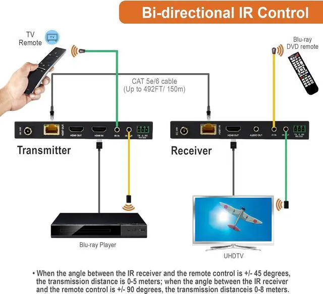 4K 60HZ 4:4:4 HDR | TRANSMITTER LOOP OUT - Transmit 4K@60Hz 4:4:4 HDR HDMI Signals up to 394 ft. (120m) via HDBaseT. Transmit 1080p up to 492 ft. (150m) over a single Cat5e/6 cable. Connect a display to the transmitters HDMI output port to view the signal being sent to the receiver.