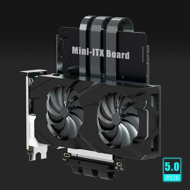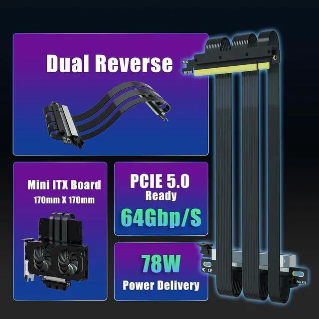 • Double reverse PCIE 5.0 riser cable for Mini-ITX motherboard (170x170mm) installation, RTX5090 (Ti) RX9070 (XT) GPU Ready