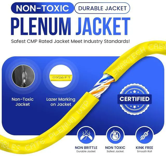 - -: The CMP plenum-rated jacket of our Cat6 ethernet cable is safe and ideal for installation in air ducts and plenum spaces. The Cat6 is fire-resistant, low-smoke emission, and compliant with building codes, ensuring safety and reliability. In case of a fire hazard, the jacket limits flame propagation and does not emit toxic smoke.