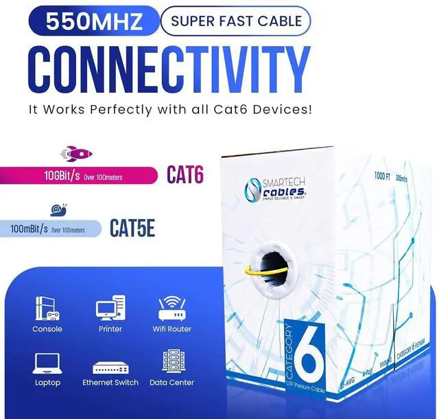 & : Our Cat6 cable 1000ft comes with the advanced center spline and tightly twisted pair design which results in crosstalk and EMI minimization. Over long and short distances, enjoy consistent, high-quality connections, even in tech-heavy environments with these Cat 6 ethernet cables. These Cat-6 Cables are compatible with Cat5e, and Cat6a as well as RJ45 Keystone jacks and connectors.