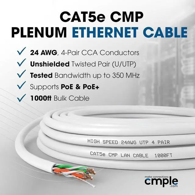 Package Includes: 1000 Feet Cat 5e Ethernet Cable is a CMP UTP Bulk Wire, 350 MHz - White 305m