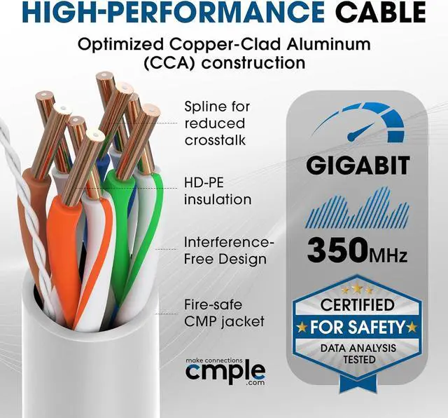 • 24AWG Cat 5e Plenum Cable Unshielded Twisted Pair Construction - Crafted with copper-clad aluminum (CCA), provides reliable performance, supporting data transfer speeds up to 100 Mbps over 100 meters and a 350 MHz bandwidth