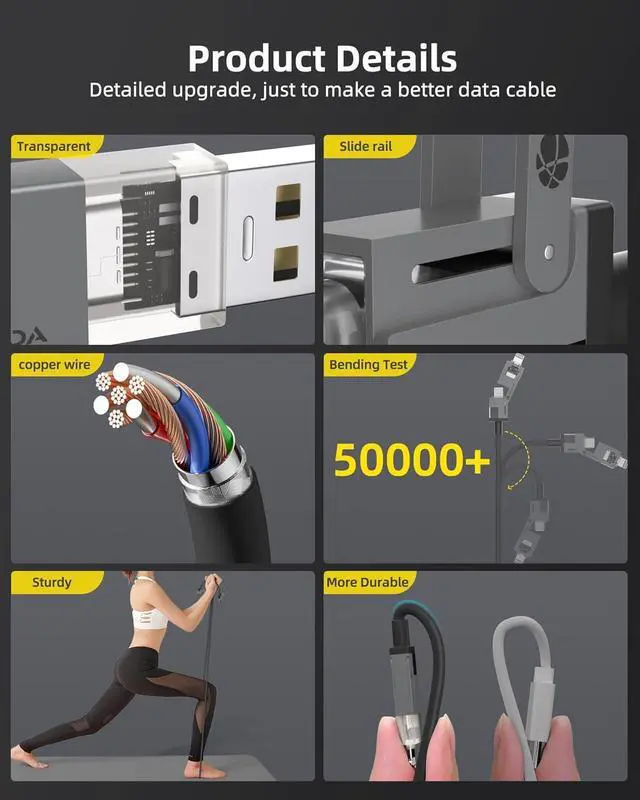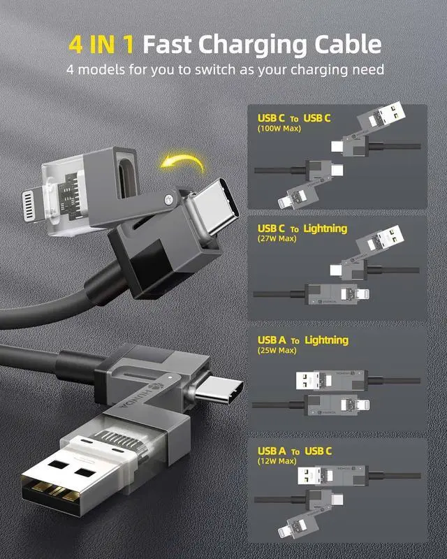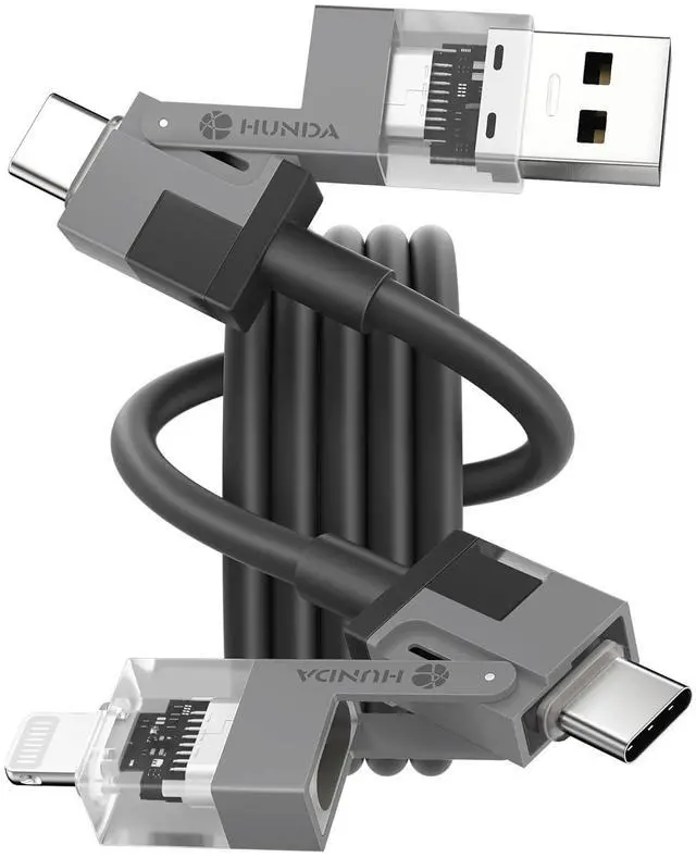 4 IN 1 Multi USB Charging CableHunda lightning cable build-in high-purity thickened copper core.ultra-low resistance charging faster, easily surpass the official, 30 minutes to charge 65%, 25 seconds to transfer 1G large files.It not only meets your need of multi-use in one line, but also solves the trouble of slow charging speed.