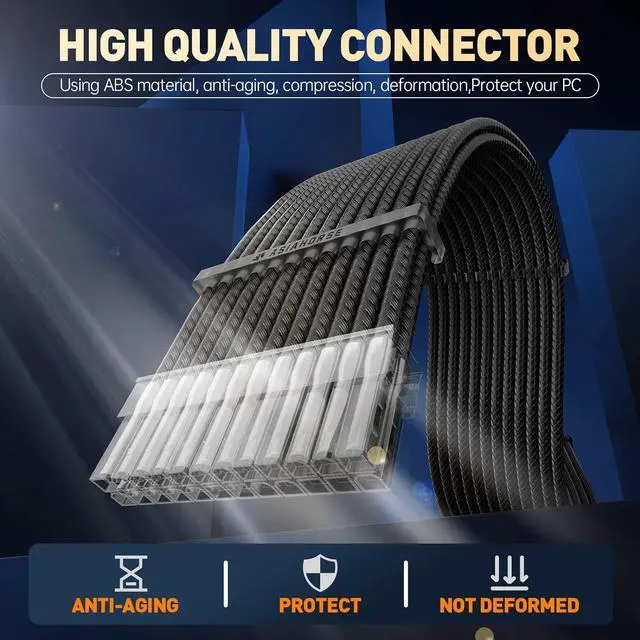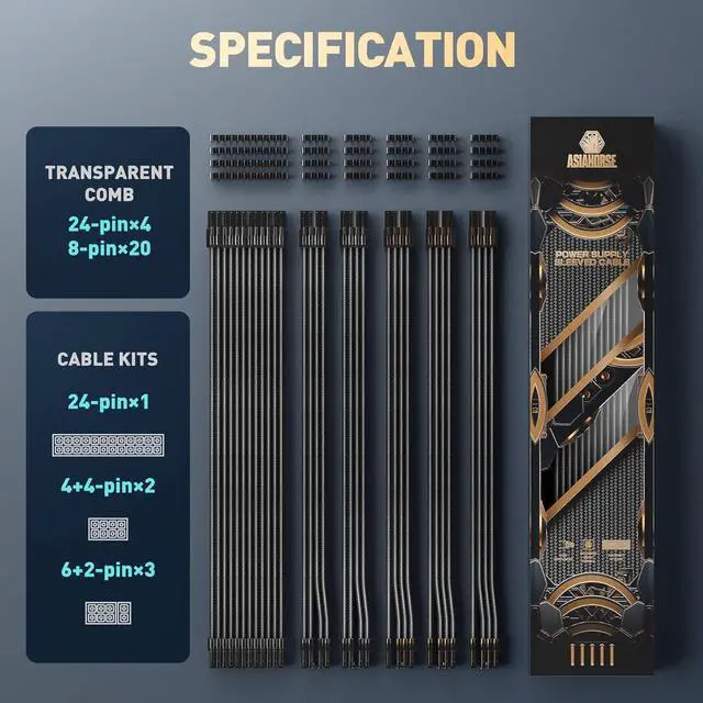 Support Double CPU MotherboardAsiahorse pc cable extension contain 1 x 24 Pin ATX Extension Cable, 2 x 4 + 4 Pin EPS Cable, 3 x 8 pin( 6+2 Pin) PCI-E Cable with 4 combs each. 2 x dual 4+4PIN CPU power cables bundled in one package. Support Double CPU M/B for Two-way performance to deliver extreme performance with 2-way overclocking power supply.