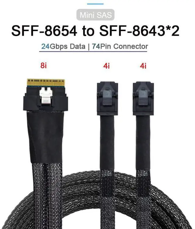 PCI-E Ultraport Slimline SAS Slim 4.0 SFF-8654 8i 74pin to Dual SFF-8643 4i Mini SAS HD Cable PCI-Express This cable can be used to connect internal devices, e.g. a backplane with Slim Line 8654 74pin connector to a controller with SFF-8643 connector.