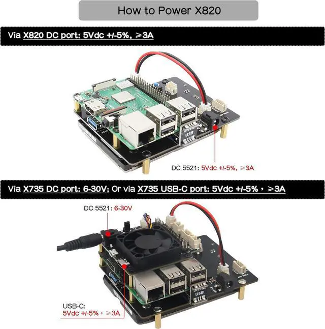 Please use this high quality certified DC 5V 4A power supply(ASIN :B07413Q5Y4).Power supply request: 5Vdc +/-5% , 4A; The power adapter not only powers Raspberry Pi board but also powers your SSD or HDD. If the power is low, the SSD/HDD may not be identified or damage your RPi or X820 board. [Do Not Use ASIN:B01K0608A0!!!]
