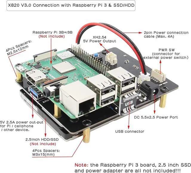 Raspberry Pi SATA X820 V3.0 HDD/SSD USB3.0 shield expansion board provides an complete storage solution for Raspberry Pi 3B+/3B motherboard, Support up to 4TB 2.5 inch SATA interface hard disk drives (HDD) / solid-state drive (SSD). A good raspberry pi sata adapter for Raspberry Pi 3B+, 3B, 2B, B+. Note: For Raspberry Pi 4 Model B 2.5 inch SATA HDD/SSD storage board, please refer to ASIN:B07VXF2HJG; For Raspberry Pi 4 Model B mSATA SSD storage board, please refer to ASIN: B07VXFGFLX