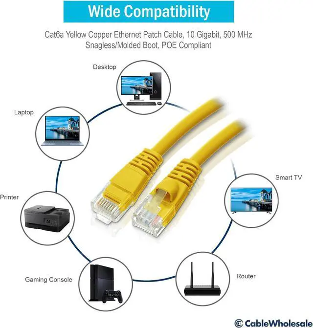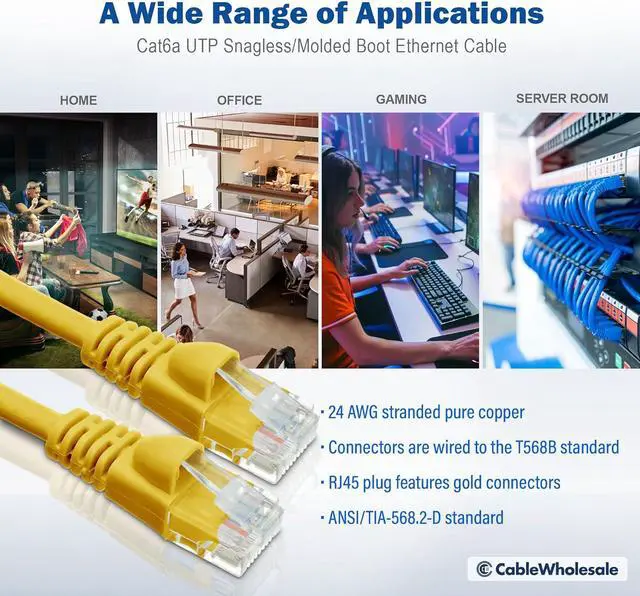 Cat6a Ethernet cables of the 50 foot length have a variety of uses. These cables will provide a greater reach for those situations that require more serious distances. These Ethernet Cables are great for the home office or any other environment. Cat6a was developed to achieve maximum distance of 90 meters for full 10-Gigabit network speeds. This robust spec will afford you the extra headroom across your network that Cat6 can not. The 500 MHz performance is double that of Category 6 and five times the bandwidth capacity of Category 5e. The extra performance is ideal for Power over Ethernet (Poe) and Voice Over Internet Protocol (VoIP) applications where data loss is audibly and visually seen and heard. The latest draft declares a new measurement for Power-Sum Alien Crosstalk to ensure neighboring pairs do not cause disturbance to the other cables. The cable center isolator maintains strict pair separation optimizing NEXT performance. Our Cat6a patch cables are complete end-to-end solution and are tested for compliance with all EIA/TIA-568-C Category 6 specifications. This particular cable is a yellow UTP (Unshielded Twisted Pair) patch cable with molded boots (snaggles installation) and extra protection for the RJ45 connector and clip. Cat6a cable includes a spline and ribbing to help ensure separation between the pairs which limits cross talk. The connectors are wired to the T568B standard. The individual conductors are 24 AWG (American wire gauge) stranded pure copper. Cat6a patch cables are stranded to improve flexibility. Pure copper conductors provide the best signal possible. The RJ45 plug features gold connectors to prevent corrosion thus ensuring a longer cable life.