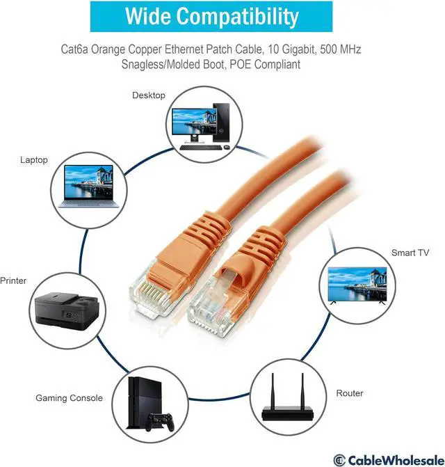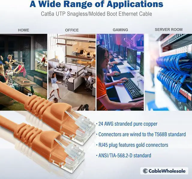 Cat6a Ethernet cables of the 25 foot length have a variety of uses. These cables will provide a greater reach for those situations that require more serious distances. These Ethernet Cables are great for the home office or any other environment. Cat6a was developed to achieve maximum distance of 90 meters for full 10-Gigabit network speeds. This robust spec will afford you the extra headroom across your network that Cat6 can not. The 500 MHz performance is double that of Category 6 and five times the bandwidth capacity of Category 5e. The extra performance is ideal for Power over Ethernet (Poe) and Voice Over Internet Protocol (VoIP) applications where data loss is audibly and visually seen and heard. The latest draft declares a new measurement for Power-Sum Alien Crosstalk to ensure neighboring pairs do not cause disturbance to the other cables. The cable center isolator maintains strict pair separation optimizing NEXT performance. Our Cat6a patch cables are complete end-to-end solution and are tested for compliance with all EIA/TIA-568-C Category 6 specifications. This particular cable is a orange UTP (Unshielded Twisted Pair) patch cable with molded boots (snaggles installation) and extra protection for the RJ45 connector and clip. Cat6a cable includes a spline and ribbing to help ensure separation between the pairs which limits cross talk. The connectors are wired to the T568B standard. The individual conductors are 24 AWG (American wire gauge) stranded pure copper. Cat6a patch cables are stranded to improve flexibility. Pure copper conductors provide the best signal possible. The RJ45 plug features gold connectors to prevent corrosion thus ensuring a longer cable life.