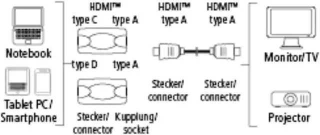 For connecting a PC/notebook/tablet PC/camcorder to a monitor/TV or projector in order to transmit digital audio, video and Ethernet data and signals