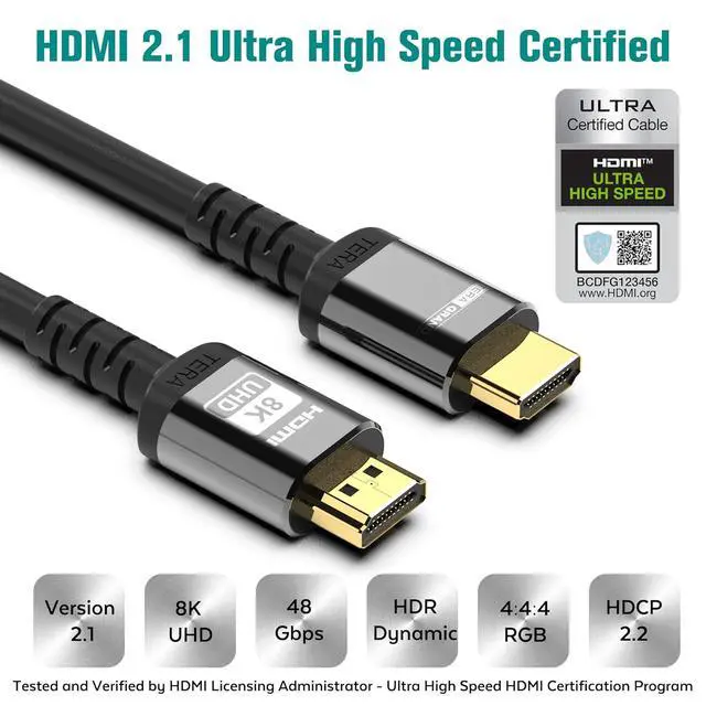 HDMI 2.1 Specification: Supports a range of higher video resolutions and refresh rates including 8K@60Hz and 4K@120Hz, and resolutions up to 10K. Dynamic HDR formats are also supported, and bandwidth capability is increased up to 48Gbps. HDMI 2.1 Ultra High Speed certified cable is rigorously tested and verified to ensure that this cable meets all HDMI 2.1 specifications including support for 8K resolution, 48Gbps throughput, advanced HDR (HDR10, Dolby Vision), and more.