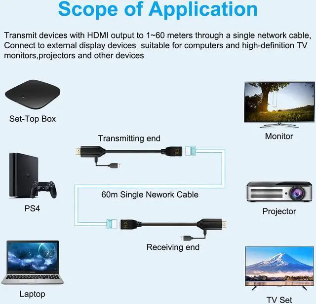 Package Included1 x HDMI 60M extender transmitter + receiver, 2 x us Power adapter