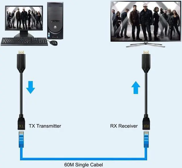 FULL HD 1080P, TRANSMISSION 196 FT Supports resolution up to 1080P@60Hz and 3D visual enjoyment. hdmi extender over cat5e cat6 cable distance max up to 196Ft (60m), stable, clear and smooth. Compliance with HDMI 1.3 standard. (We recommend using high performance Cat5e/Cat6 cable to ensure reliable performance).