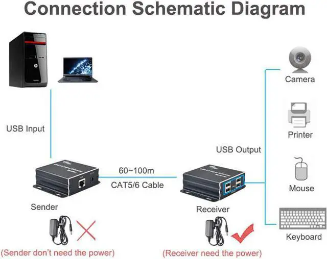 USB Extender supports high-speed USB2.0 (Up to 480Mbps) over single Cat5e/Cat6 cable up to 196ft(60m), USB1.1 device over single Cat5e/Cat6 cable up to 328ft(100m);(in order to get better performance, we recommend CAT6 or above ethernet cables)