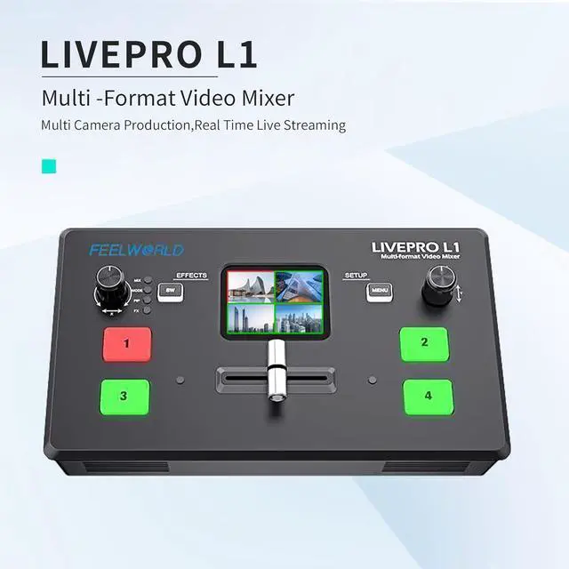 FEELWORLD L1,4 buttons used to switch input signal sources; menu buttons used to select and set menus; SW buttons used to select various functions; left knob Is used for audio control; the right knob is used for menu settings. From the front panel TFT screen, you can display four preview (PVW) screens, or display the logo and signal source name to prevent miscuts.