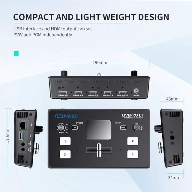 The FEELWORLD L1 switcher is equipped with four HDMI signal input interfaces and one HDMI output interface. All HDMI interfaces support 1080p format. The equipped USB3.0 interface can realize live streaming. One LAN interface is used for control and upgrade.