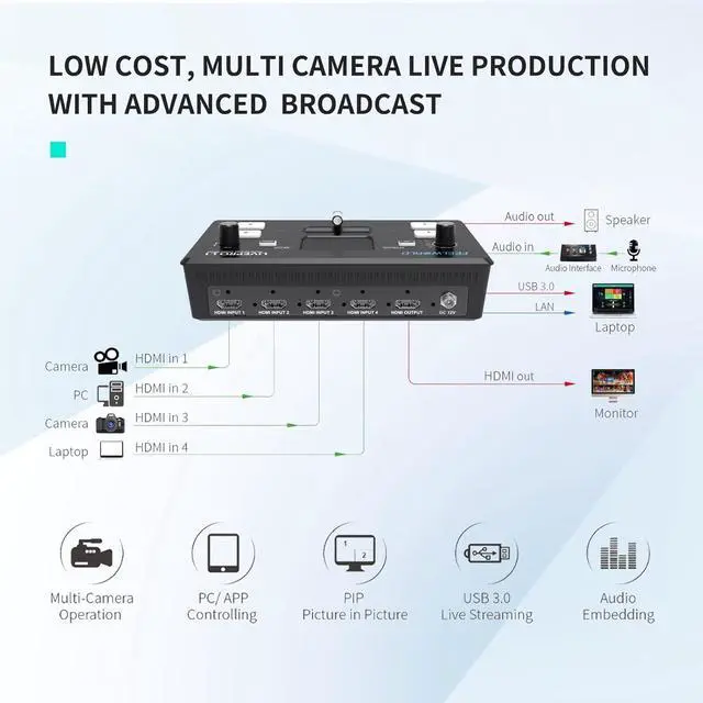 Through the USB3.0 interface, the switcher can be connected to any computer and used with streaming media software of various social media platforms. You can also connect to PPT slides, video clip playback, and computer or game consoles with websites. It switches all content in real time, allowing you to live stream on major national and international social media platforms such as Youtube, Facebook and TikTok.
