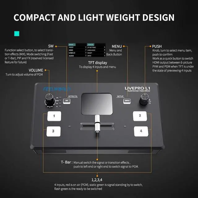 The T-Bar of FEELWORLD L1 support 14 transition effects and signal switching. Under T-Bar mode, pushing green button, it will flash and push T-Bar to the end (left or right), the source will be switched with selected transition effect