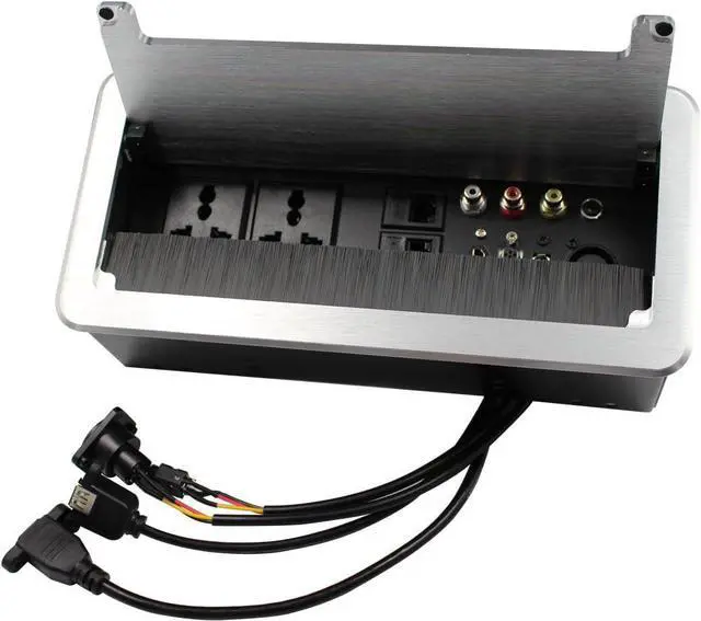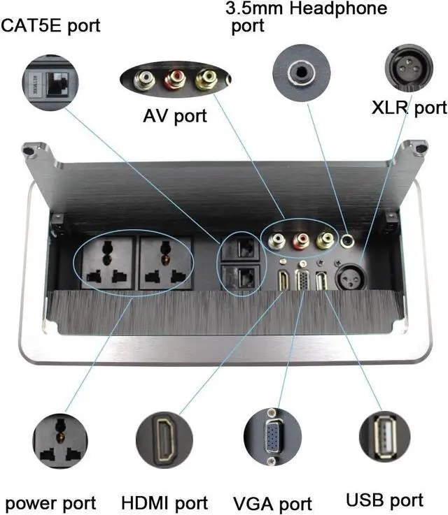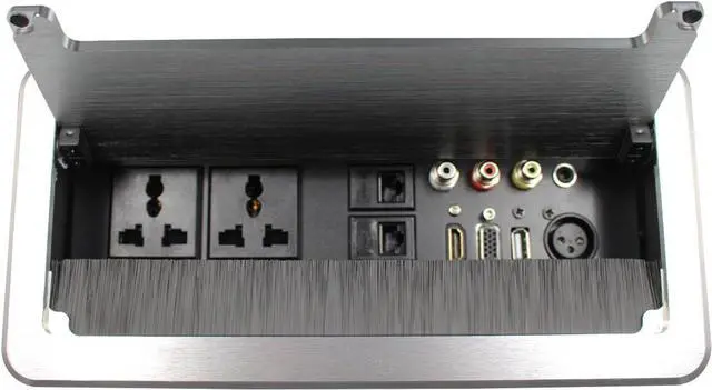 AC Power: NEMA F/M, 110VAC, 60Hz, 5A Video: HDMI , VGA, USB,AV Stereo Audio: XLR,3.5mm F/M Network: CAT6 RJ45 F/M While not in use, the unit closes flush with the table and opens and closes by pressing on top panel