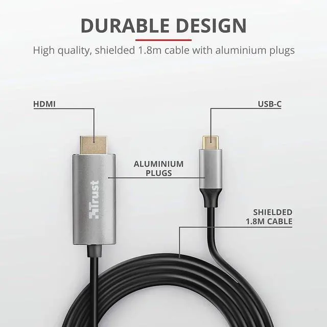 Durable, shielded 1.8M cable with high quality aluminium connectors