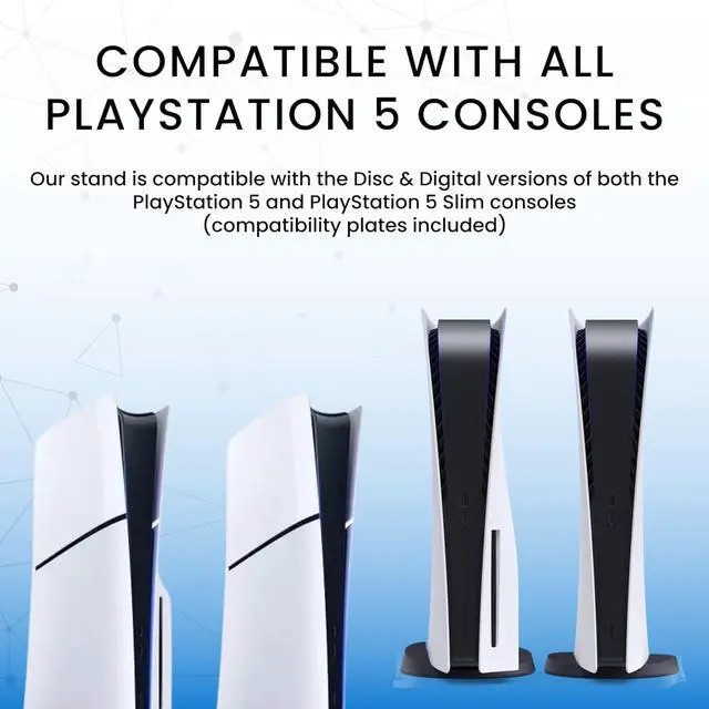 • COMPATIBLE WITH PLAYSTATION 5 SLIM & ORIGINAL CONSOLES || Our stand is compatible with the original PlayStation 5 Disc/Digital versions as well as the PlayStation 5 Slim Disc/Digital versions (compatibility plates included)