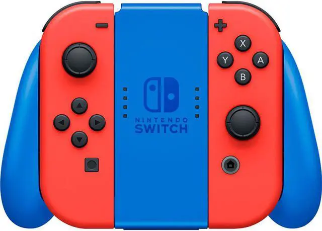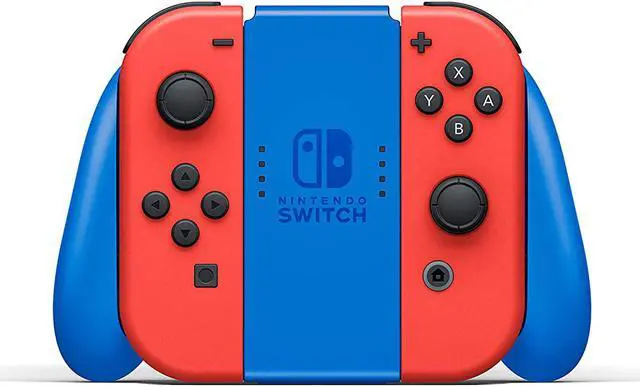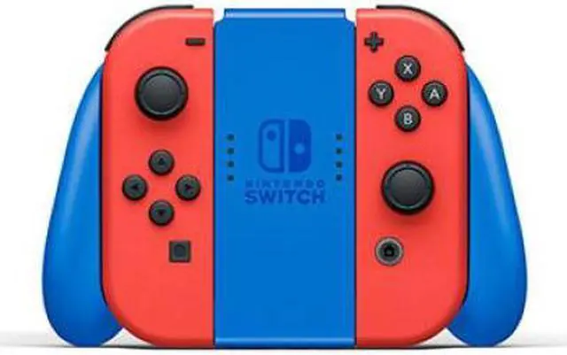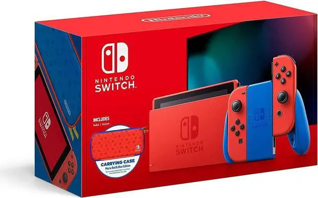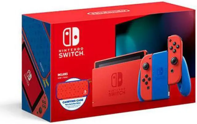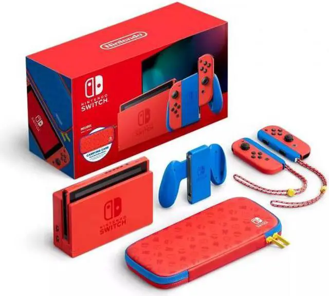 Included in the box: Nintendo Switch Mario Red & Blue Edition Switch Dock Joy-Con (L) Red Joy-Con (R) Red 2 x Joy-Con Strap Joy-Con Grip HDMI Cable AC Adapter Super Mario Carrying Case Screen Protector