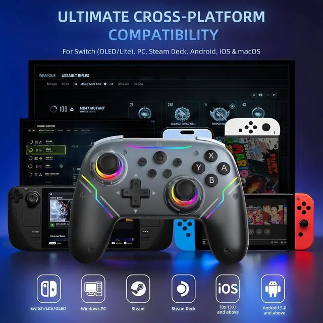 CompatibilityThis Wireless Controller Compatible with Nintendo Switch/Switch 2/Switch OLED Model/Switch Pro/Switch Lite/Android/iOS/Mac,also Support PC and Steam Deck Platforms(Note: Our Wireless Switch 2 Control Can be Connected to the PC with Bluetooth. If the PC does not have Bluetooth, it can be connected to the PC with the USB adapter We Provide