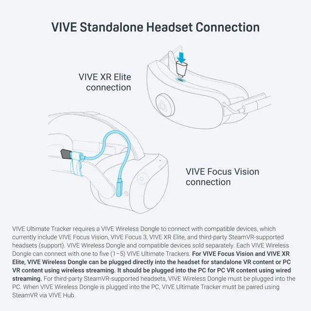 The 2.4GHz Wireless Dongle for VIVE Ultimate Tracker conveniently plugs in via USB Type-C, offering compatibility with VIVE XR Elite and VIVE Focus 3. Future support for other standalone and PC VR headsets is also planned, making this device a versatile addition to your VR setup.