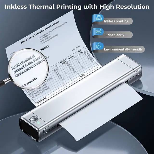 No ink Printer: M08F-Lettter compact printer, using advanced Direct Thermal Printing Technology,provides clear text every time. This impresora portatil is more environmentally friendly and safer because it needs no ink,toner and ribbon. (ATTENTION: This printer only support thermal paper not regular paper)