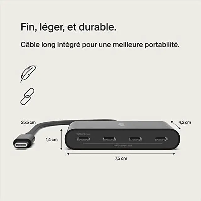 Transfer your data files seamlessly courtesy of up to 10Gpbs of bandwidth and enjoy pass-through Power Delivery charging up to 100W. Built for durability, the tethered USB-C cable withstands strain and this hub's overvoltage, overcurrent, and short circuit protection and 2-year warranty give you peace of mind.